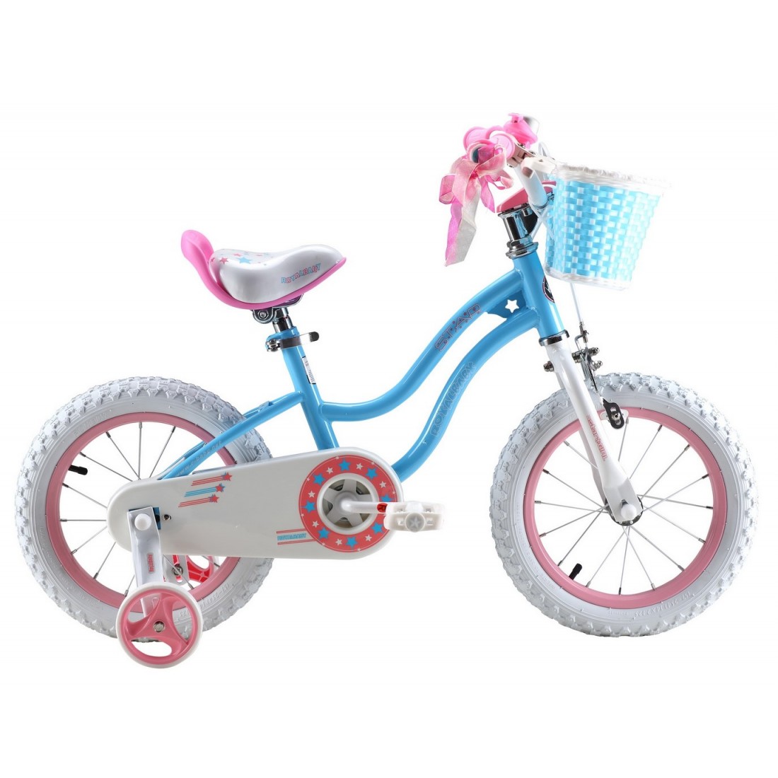 - BICICLETA ROYALBABY STARGIRL PENTRU FETE - Designul fashionable și combinația clasică de culori. Decorațiunile strălucitoare sub formă de stele atrag atenția și sugerează că fiecare fată este unică, independentă, se dezvoltă în ritmul ei propriu și strălucește ca stelele de pe cer.